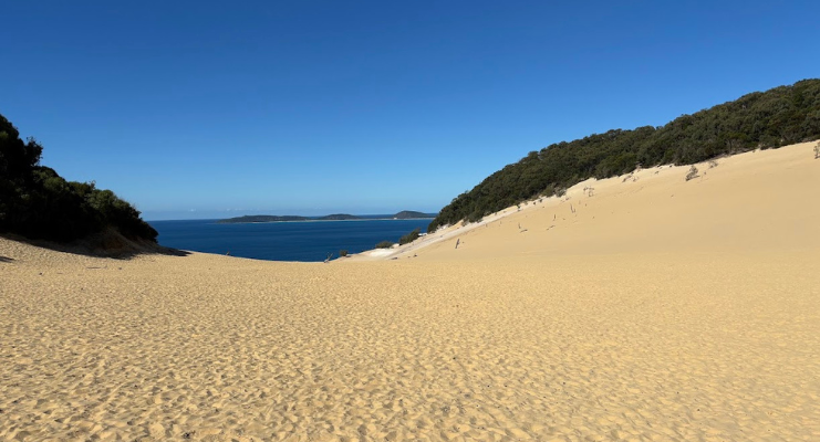 まるで砂漠に迷い込んだような、広大な白い砂丘が広がる絶景スポット。真っ白な砂丘がどこまでも広がり、目の前には青い海とフレーザー島を望むことができます。夕暮れ時には、砂と空が黄金色に染まり、息をのむほど美しいサンセットを眺められます。風を感じながら、ゆっくりと砂丘を歩くだけでも心が癒されるスポットです。