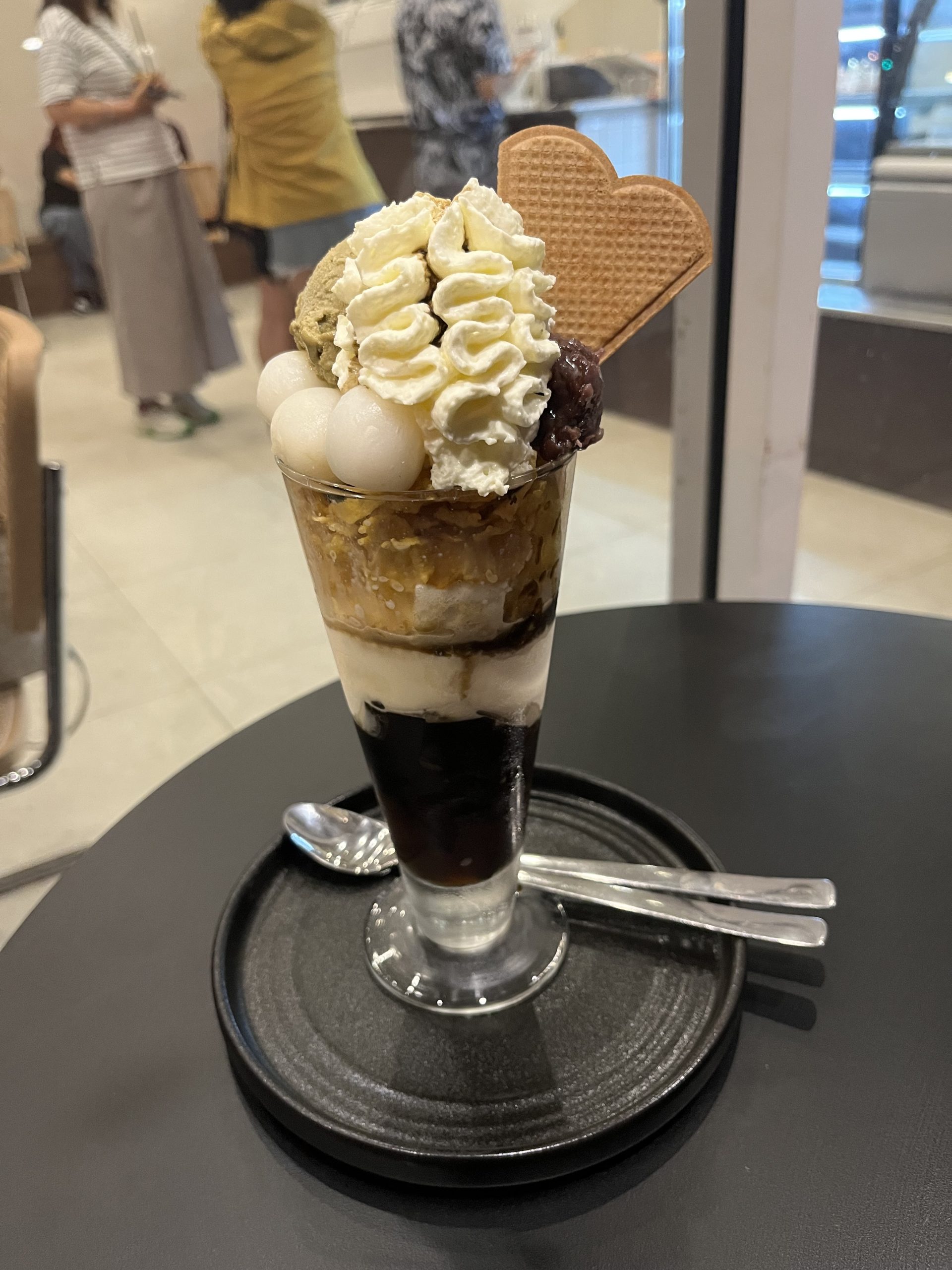 香ばしいほうじ茶の風味がふんだんに楽しめる、見た目も華やかな贅沢パフェ。アイスやゼリー、スポンジなどが層になっていて、食べ進めるたびに味が変化します!